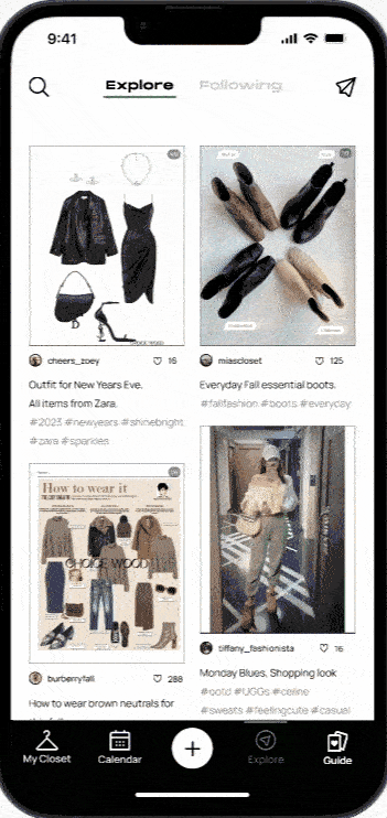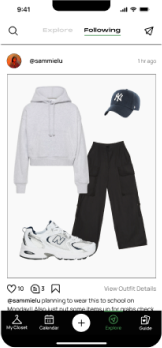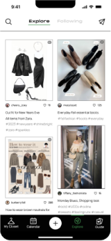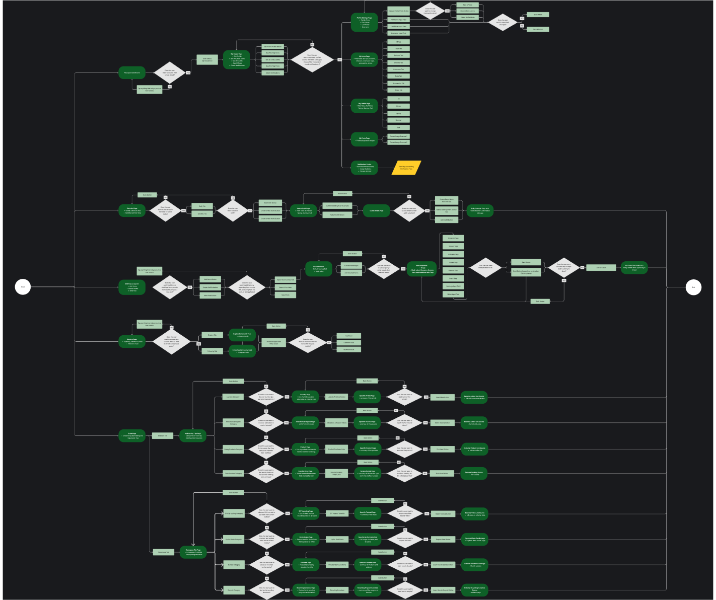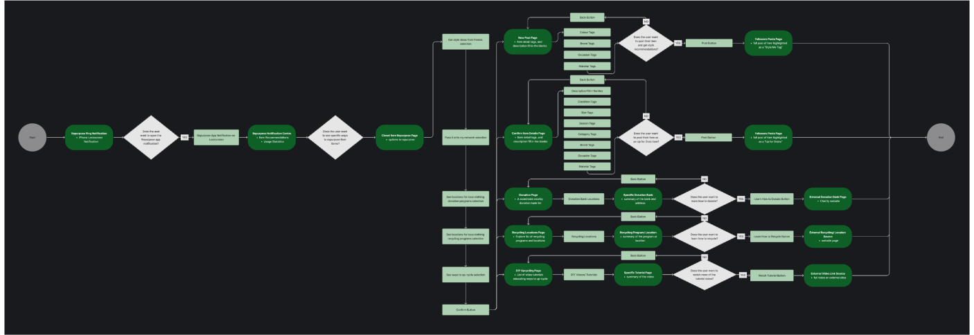 One of our app’s distinctive features is reminding users of their under-utilized wardrobe pieces by providing them with options for revitalization or sustainable disposal. I created a diagram outlining the step-by-step process that users follow when encountering this feature. It begins by sending a reminder notification. Once alerted, users can seamlessly navigate to the app, where they are presented with various choices of creating a post and sharing the item with their fashion community to explore styling tips and ideas from their network. Alternatively, they have the option to access resources for sustainable disposal methods, promoting eco-conscious choices.