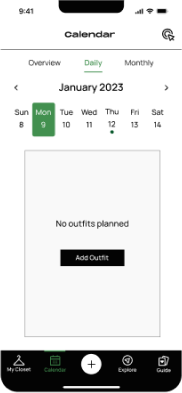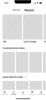 Our journey began with extensive research, including the creation of user personas and user journey maps, which allowed us to empathize with our target audience. To further distill our insights and generate innovative solutions, we applied ideation techniques like “Crazy 8s” for rapid idea generation, prioritization grids to rank potential features, and “Big Dot Voting” to collectively identify top priorities. Common themes that we came across in our solutions were ideas that prolonged clothing lifecycles, maintain clothing articles, and contributing to sustainable fashion practices.